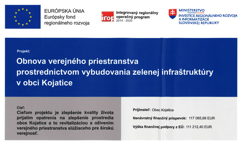 Názov poskytovateľa: Ministerstvo životného prostredia Slovenskej republiky Názov sprostredkovateľa: Slovenská inovačná a energetická agentúra Názov prijímateľa: Obec Kojatice Kód projektu v ITMS2014+: 310041I450 Operačný program: Kvalita životného prostredia Obdobie realizácie projektu: 01/2017 – 05/2020 Výška NFP: 233 994,50 €